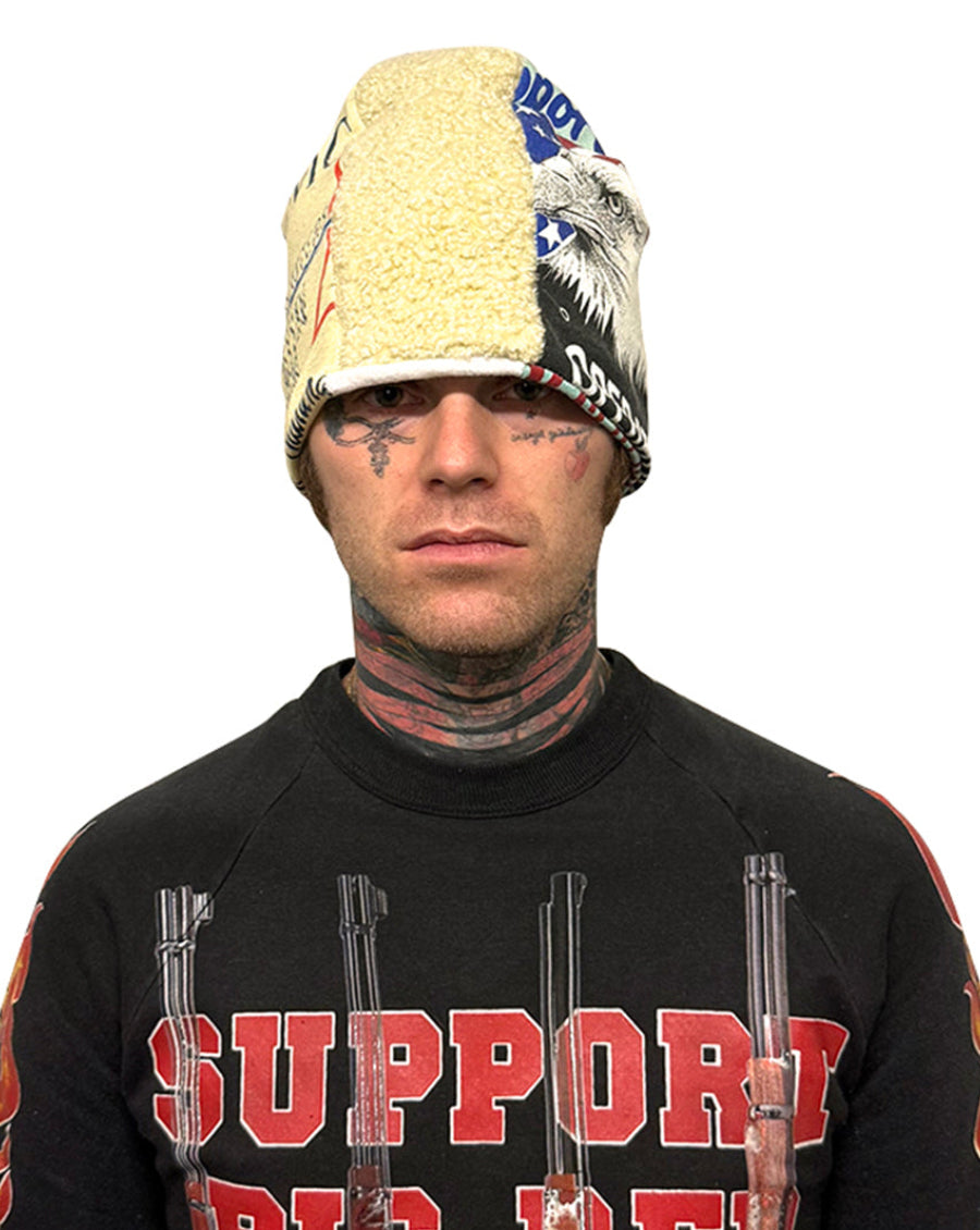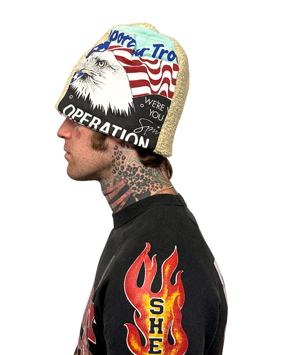 The Mr. Tee Beanie. A symbol of the ethos of the brand, JOSHUA JAMAL. The Mr. Tee Beanie is a reversible piece made from reconstituted vintage t-shirts and tuscan lambskin, making each cap an entirely one-of-a-kind piece. All orders ship out within 1-2 weeks.