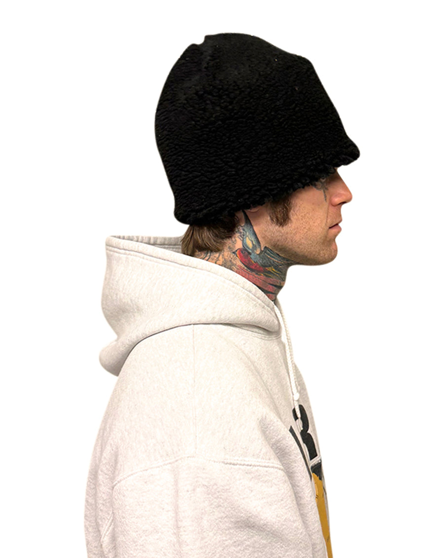 The Sherpa T-Beanie. A symbol of the ethos of the brand, JOSHUA JAMAL. The Sherpa T-Beanie is a reversible piece made from reconstituted vintage t-shirts and sherpa, making each cap an entirely one-of-a-kind piece. All orders ship out within 1-2 weeks.
