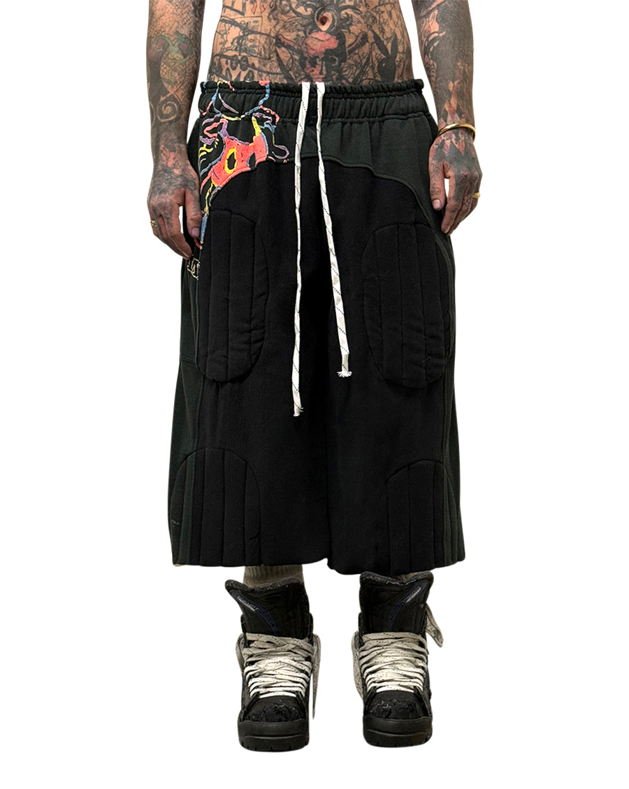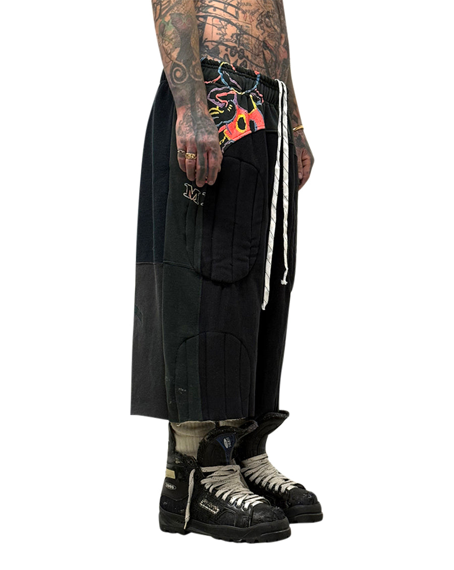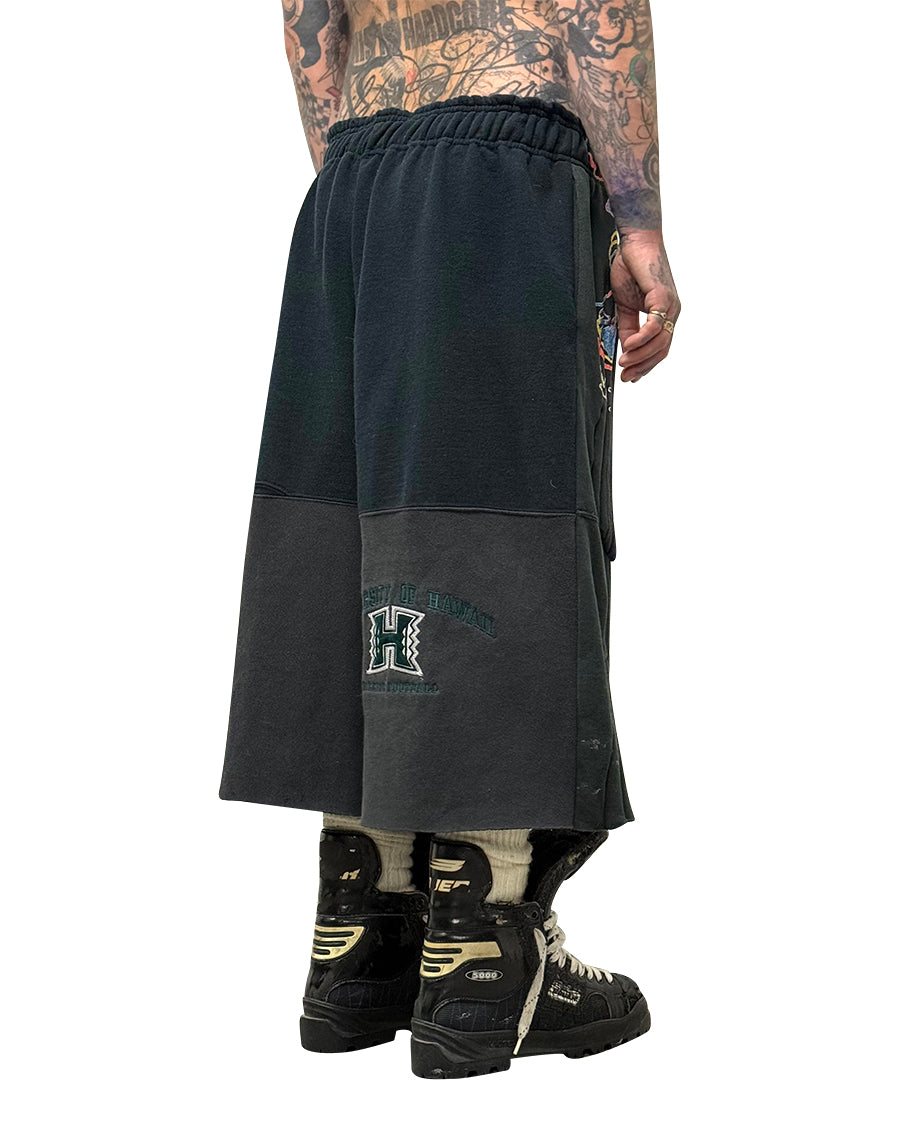 The Wave Padded sweat-short. A symbol of the ethos of the brand, JOSHUA JAMAL. The Wave Padded sweat short is made from reconstituted vintage sweatshirts, making each short an entirely one-of-a-kind piece. All orders ship out within 1-2 weeks.