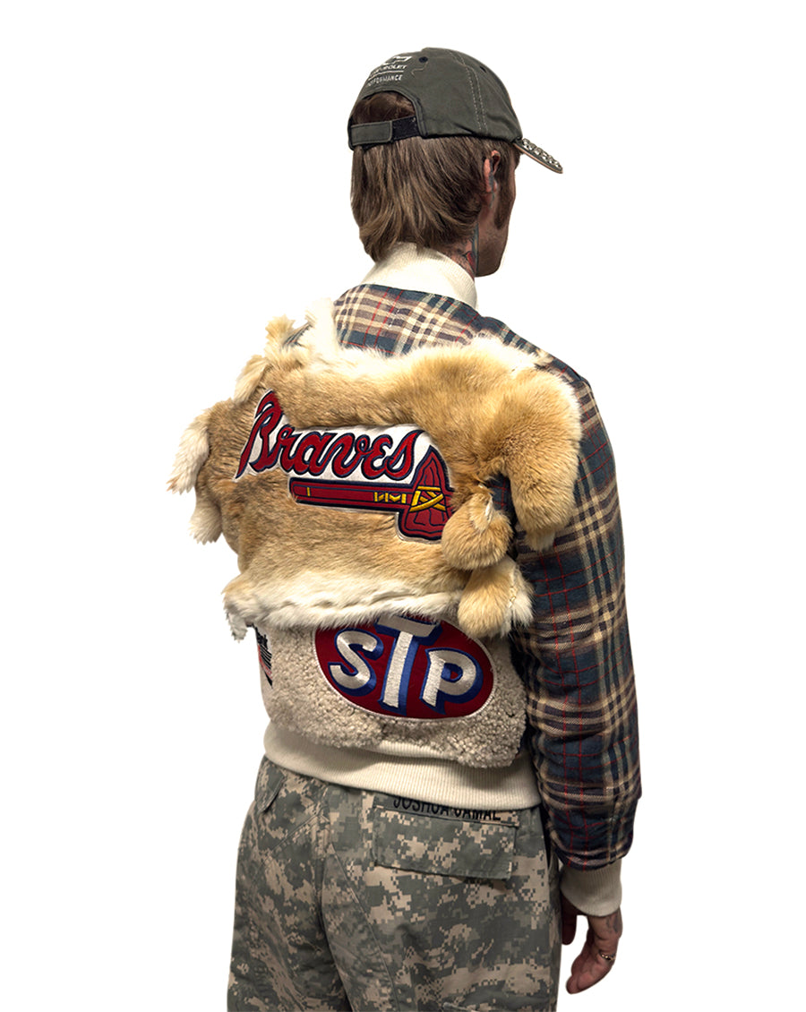 Souvenir Flesh Bomber. A symbol of the ethos of the brand, JOSHUA JAMAL. The Souvenir Flesh Bomber is made from reconstituted vintage patches, flannels and Tuscan Lambskin, making each Bomber an entirely one-of-a-kind piece. Orders ship out within 1-2 weeks.