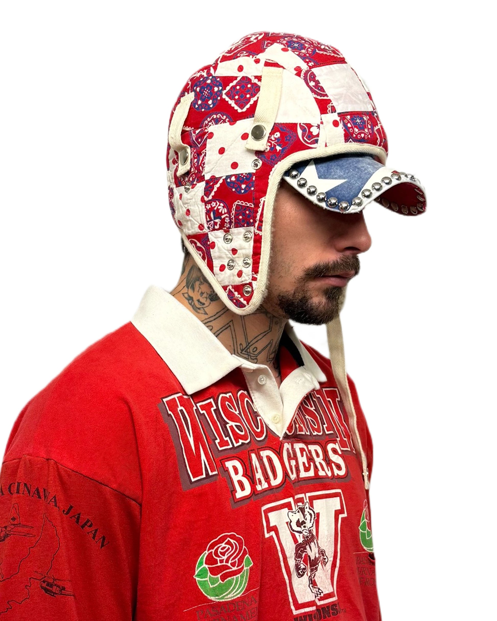 The Helmet Cap. A symbol of the ethos of the brand, JOSHUA JAMAL. The Helmet Cap is a reversible piece made from reconstituted vintage work blankets/tarps and Tuscan Lambskin, making each cap an entirely one-of-a-kind piece. All orders ship out within 1-2 weeks.