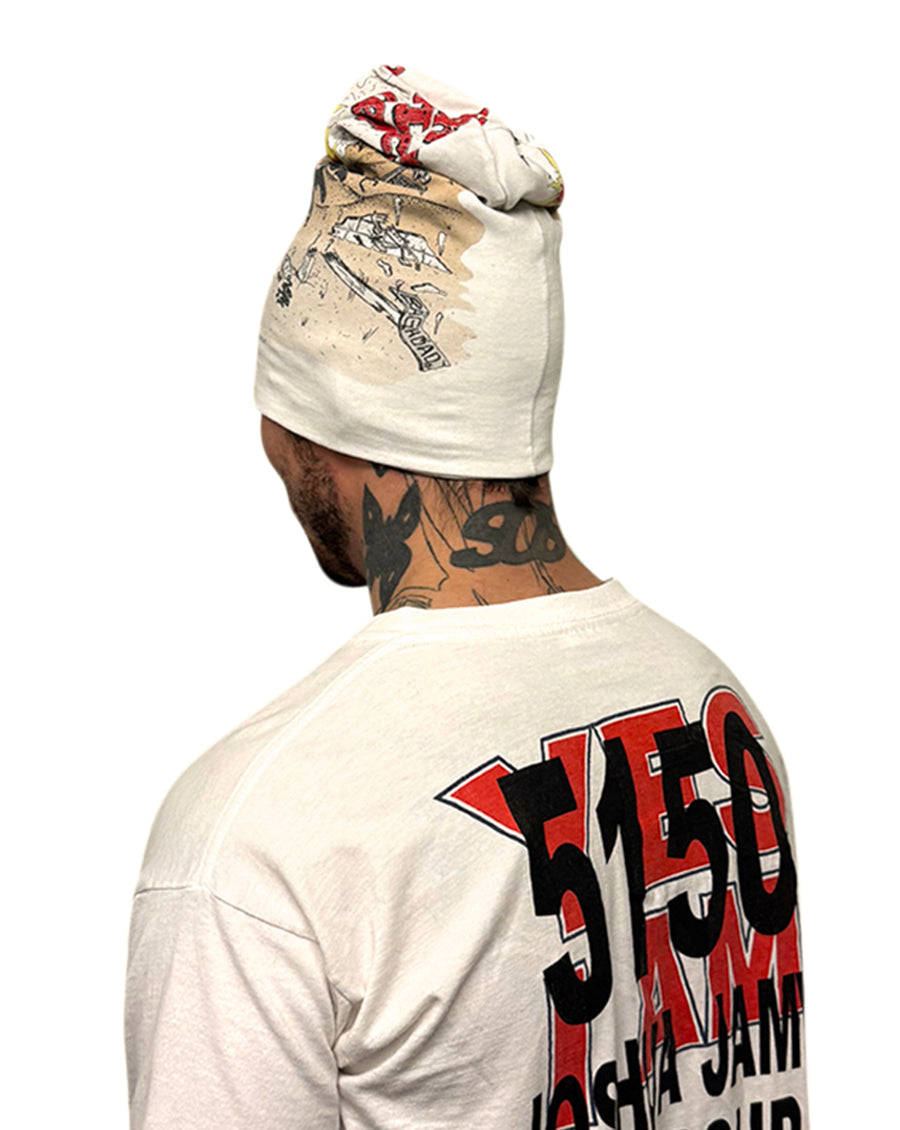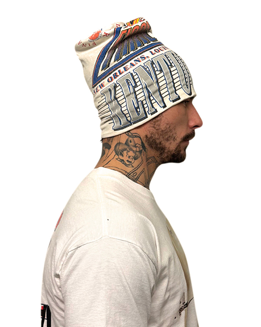 The T-Beanie. A symbol of the ethos of the brand, JOSHUA JAMAL. The T-Beanie is a reversible piece made from reconstituted vintage t-shirts, making each cap an entirely one-of-a-kind piece. All orders ship out within 1-2 weeks.