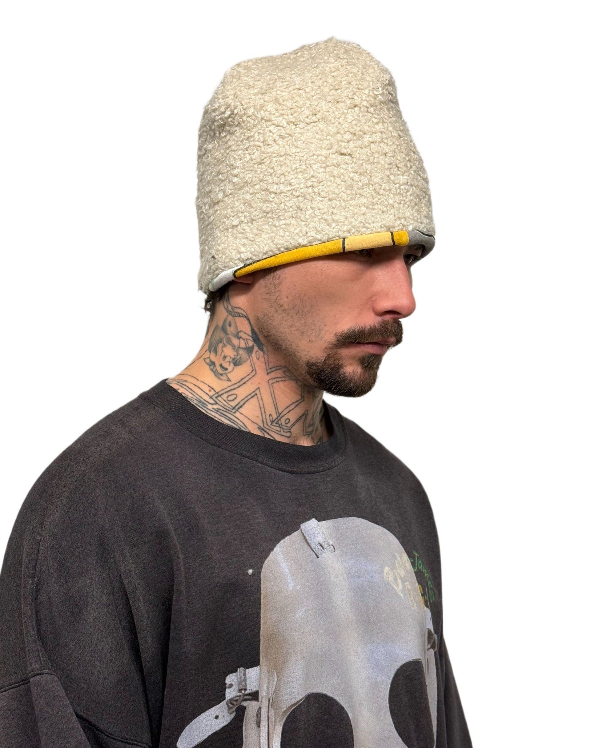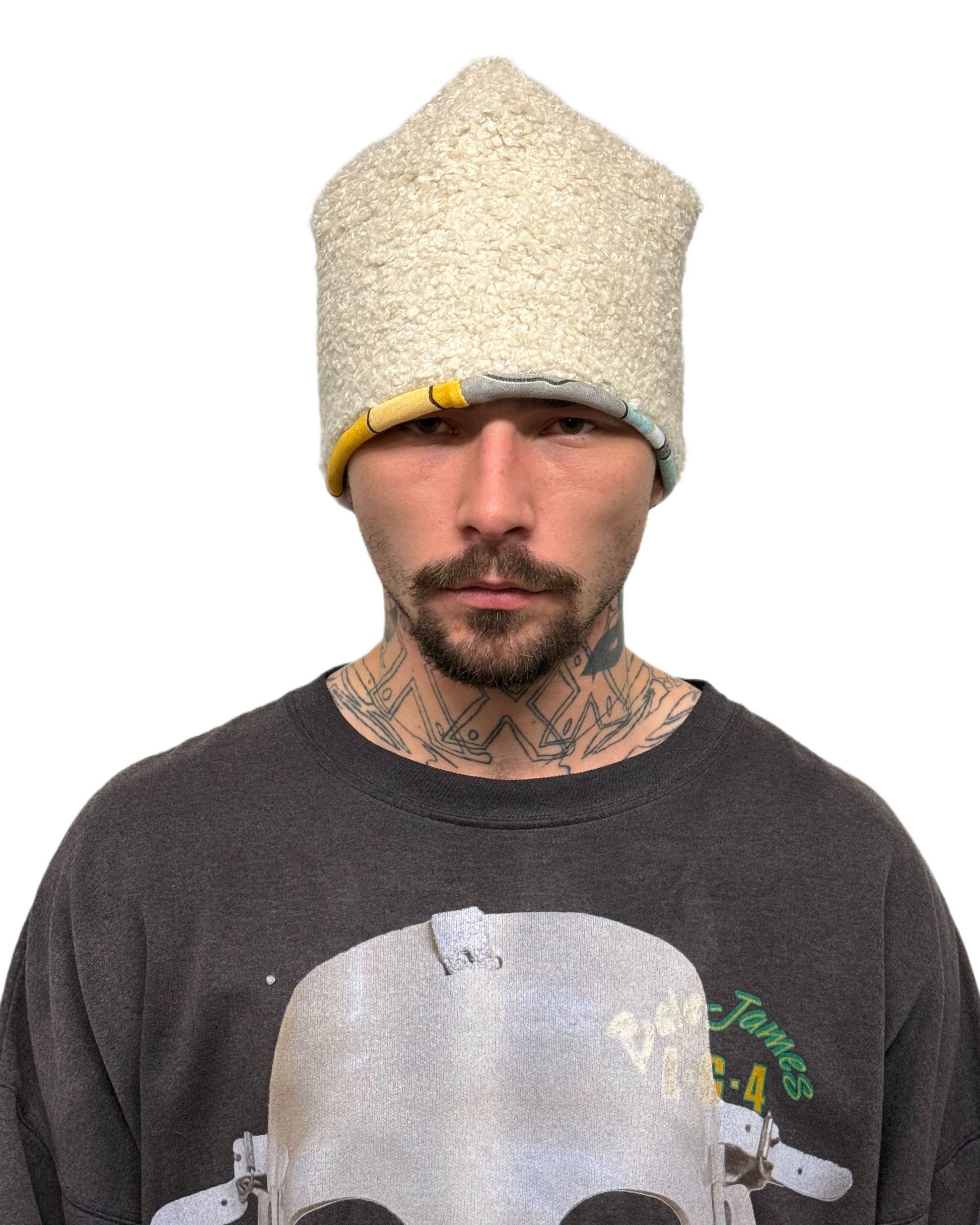 The Sherpa T-Beanie. A symbol of the ethos of the brand, JOSHUA JAMAL. The Sherpa T-Beanie is a reversible piece made from reconstituted vintage t-shirts and sherpa, making each cap an entirely one-of-a-kind piece. All orders ship out within 1-2 weeks.