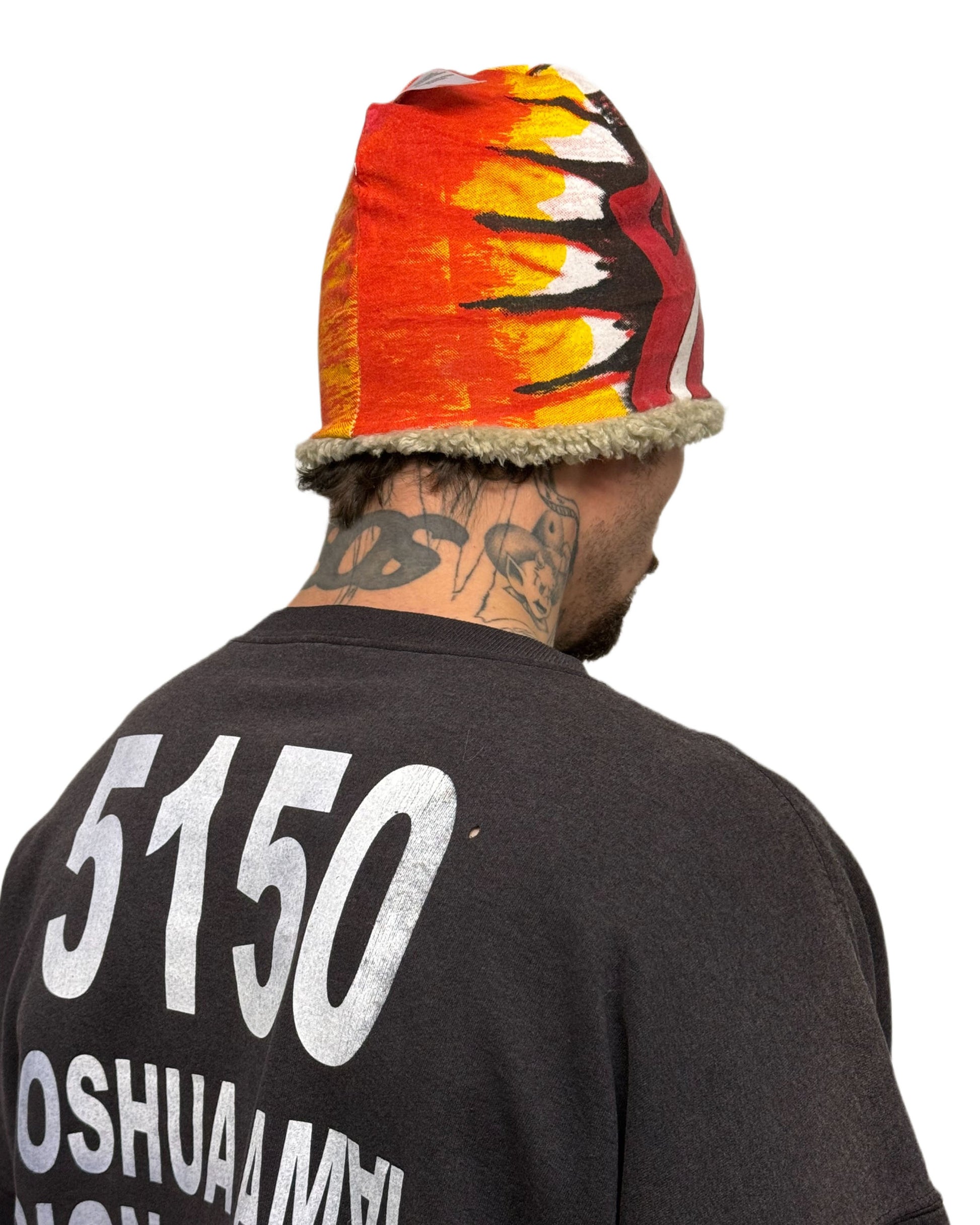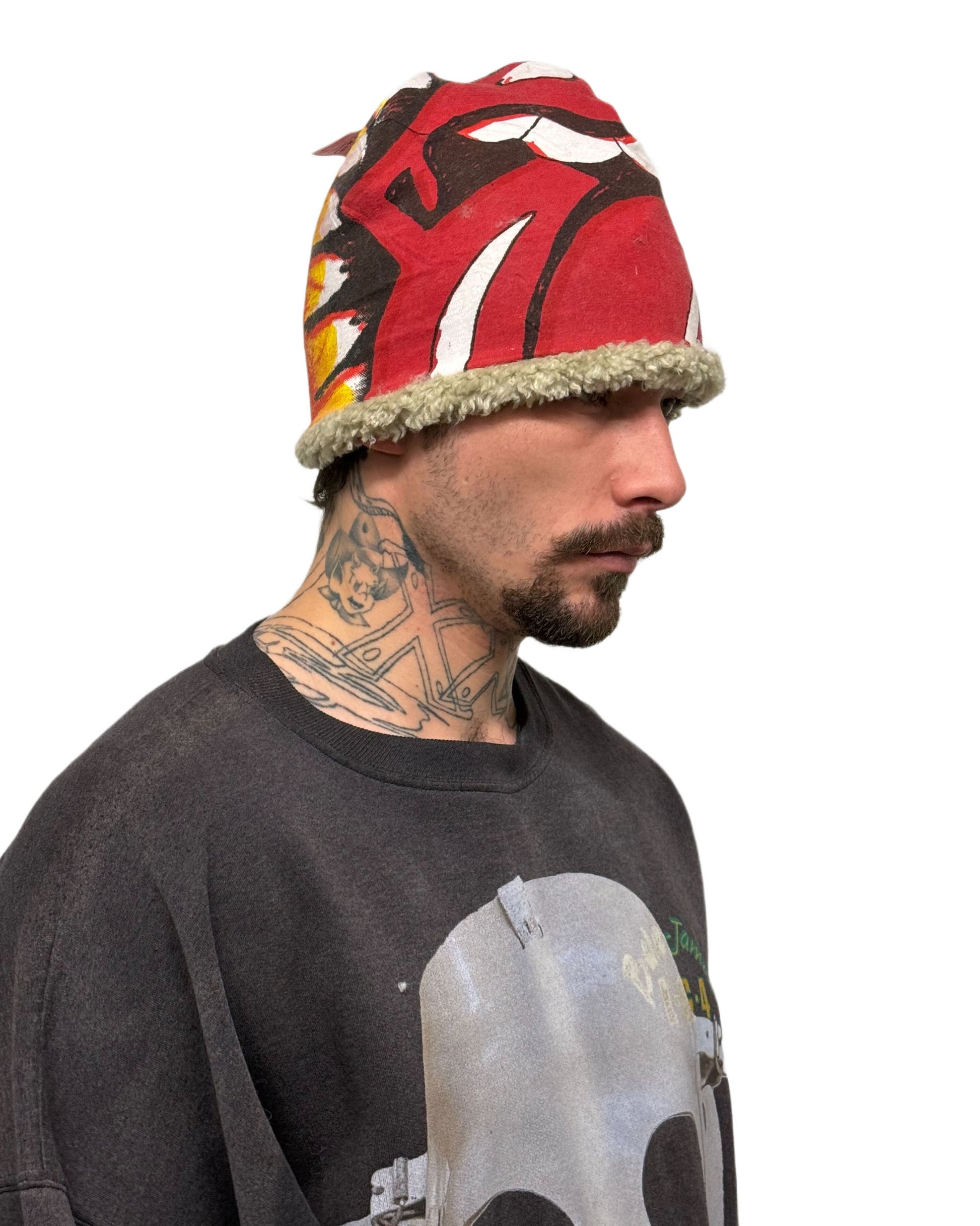 The Sherpa T-Beanie. A symbol of the ethos of the brand, JOSHUA JAMAL. The Sherpa T-Beanie is a reversible piece made from reconstituted vintage t-shirts and sherpa, making each cap an entirely one-of-a-kind piece. All orders ship out within 1-2 weeks.