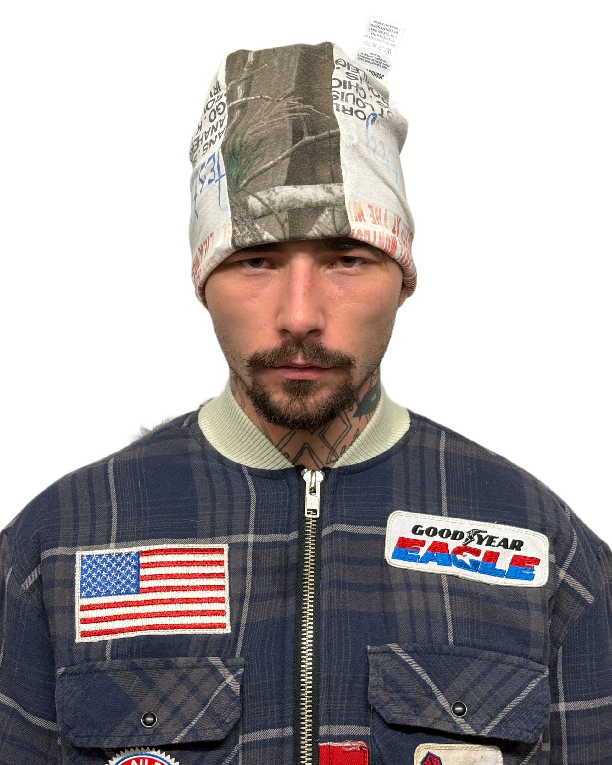 The Mr. Tee Beanie. A symbol of the ethos of the brand, JOSHUA JAMAL. The Mr. Tee Beanie is a reversible piece made from reconstituted vintage t-shirts and Sherpa, making each cap an entirely one-of-a-kind piece. All orders ship out within 1-2 weeks.